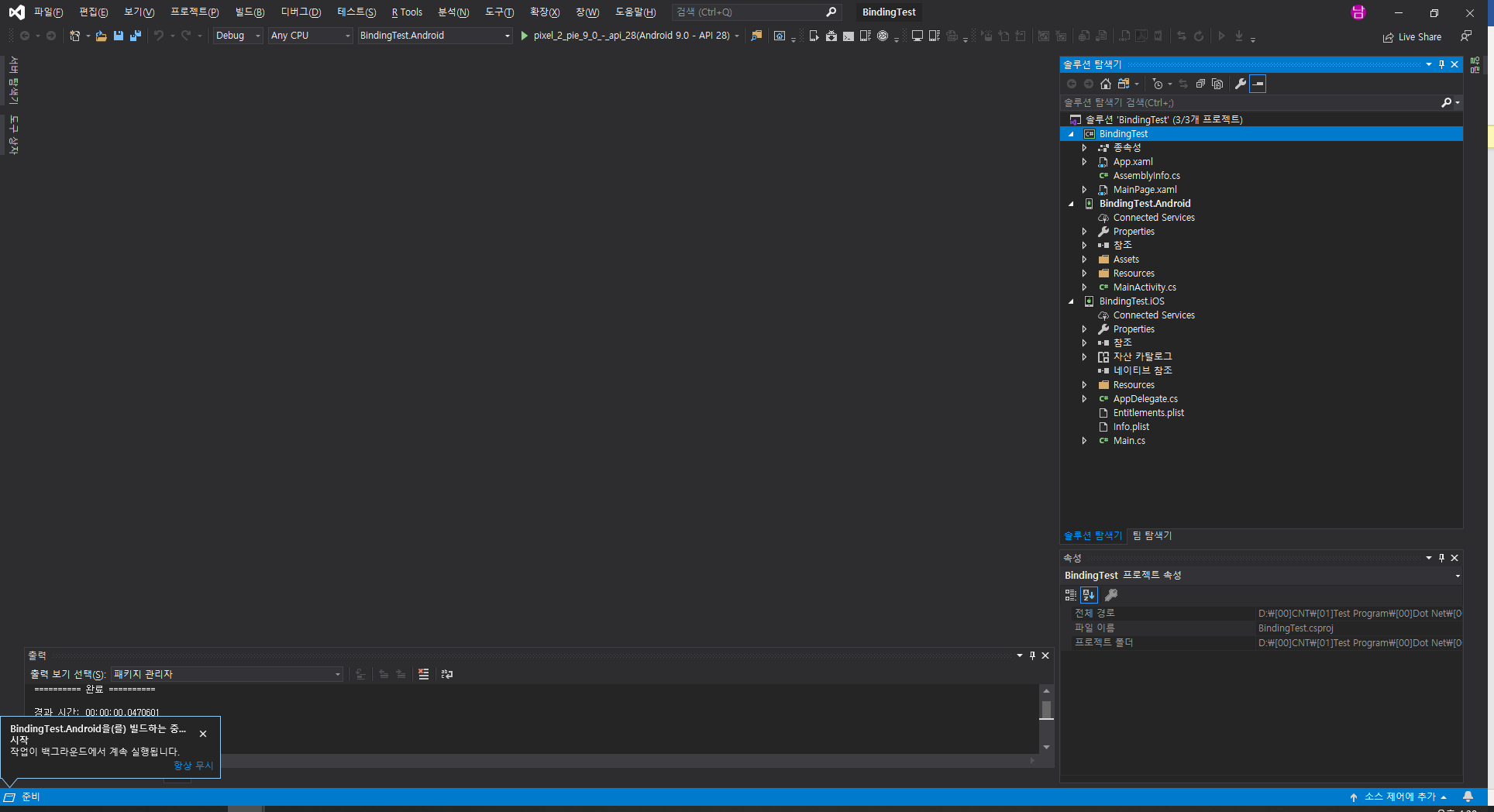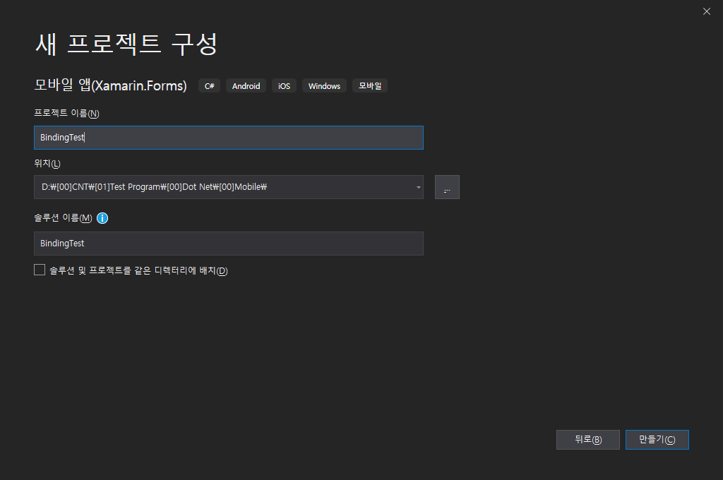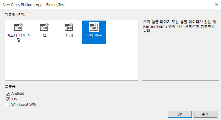 프로젝트를 생성해주는데 프로젝트의 이름은 BindingTest로 하겠습니다.