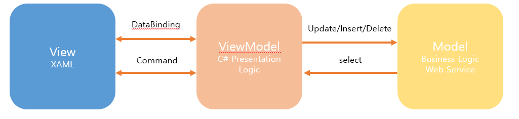 위의 그림에서 바인딩을 할 때는 해당 컨트롤의 속성에 “Binding”이라는 단어를 사용하여 바인딩을 해줍니다. Label에는 Text속성에 Content를 바인딩하여 ViewModel의 Content의 값이 변경될 경우 변경된 값을 넣어주도록 바인딩 되었습니다. Button은 Command라는 속성에 BtnCommand를 바인딩하여 Button의 Click 이벤트시 ViewModel의 BtnCommand를 실행하도록 바인딩 되었습니다.