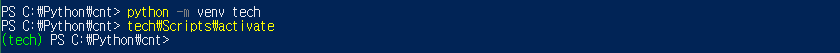 저는 tech라는 이름으로 가상 환경을 설치했으므로 tech라는 폴더가 추가된것을 확인할 수 있습니다.