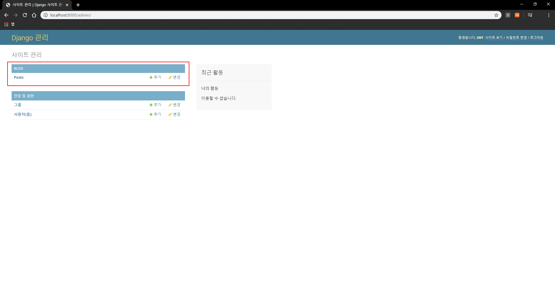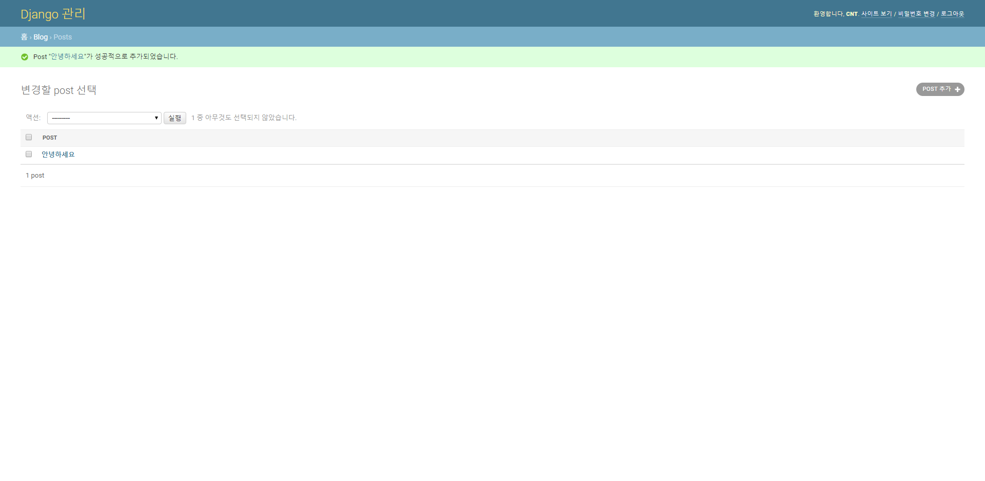 기존의 admin화면에 비해 blog 앱이 새로 생겼고, Post라는 model 생성된 것을 확인할 수 있습니다.