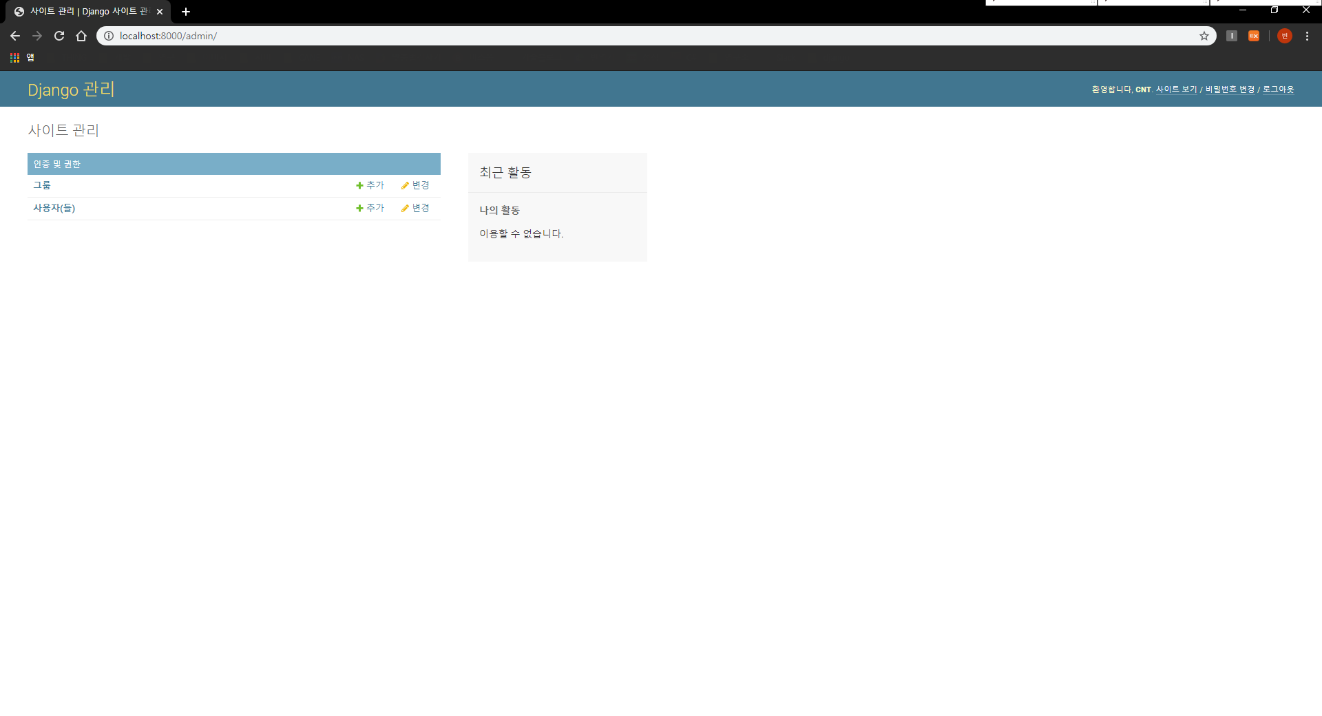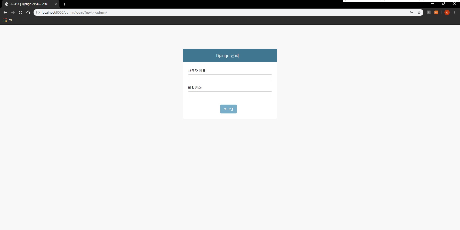 admin 계정을 생성했다면 장고 서버를 실행하고, 계정이 제대로 생성되었는지 확인합니다.