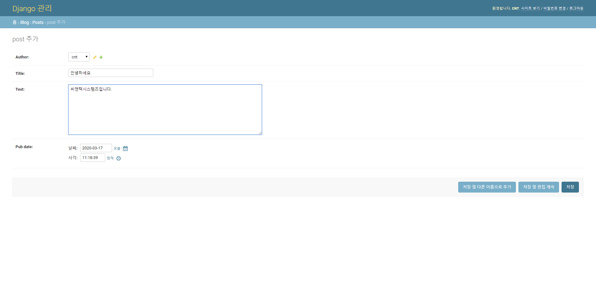 작성자를 선택하고, 게시글 작성 후 저장을 클릭합니다.