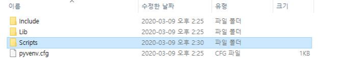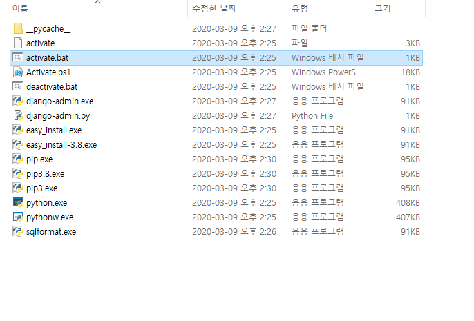 가상환경을 실행하기 위해서 가상 환경 폴더 아래 있는 Scripts폴더의 activate.bat를 실행해야 합니다.