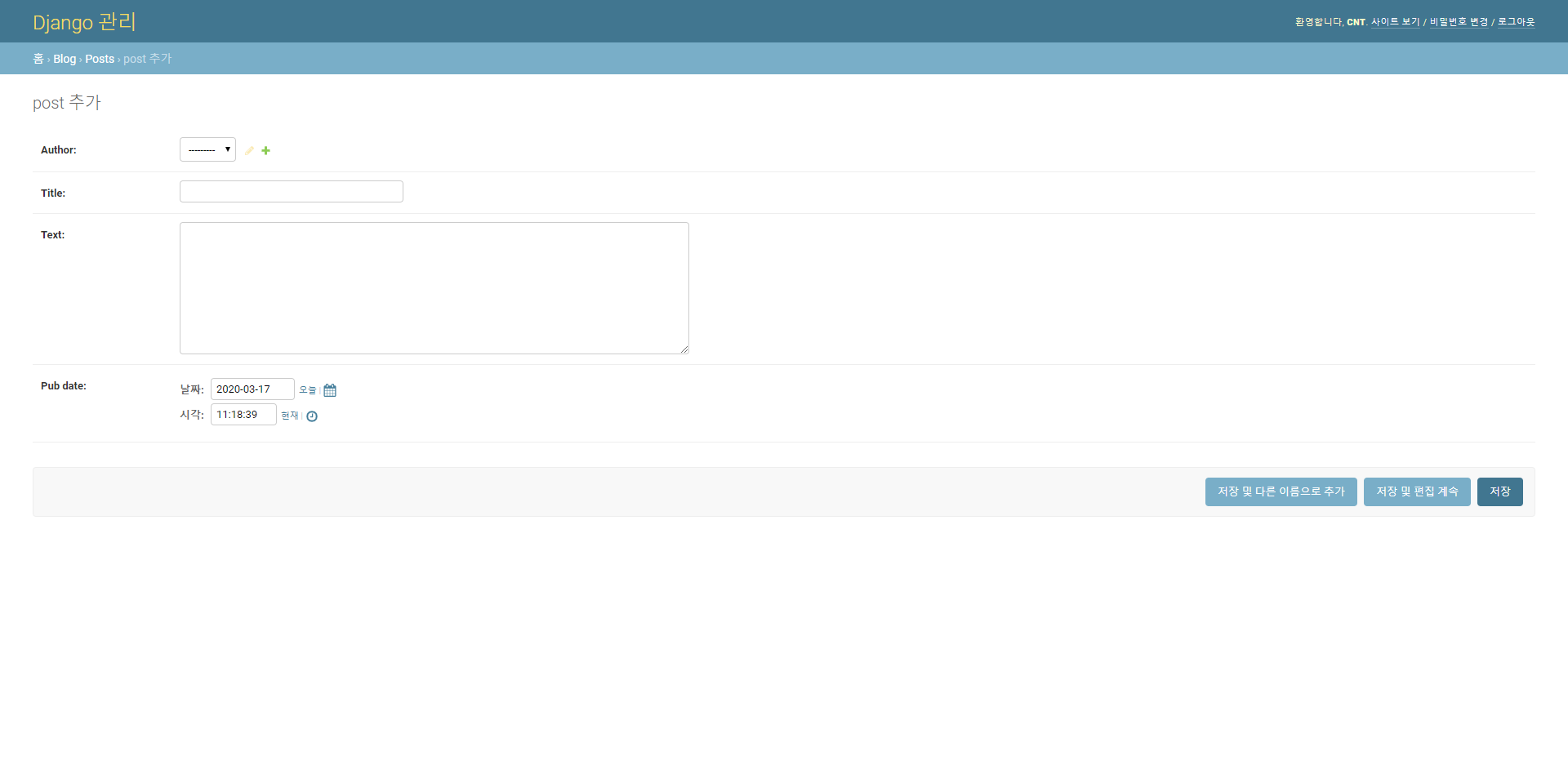 Pub date 는 3-3에서 모델을 정의할 때 디폴트 값을 현재로 해놓았기 때문에 자동으로 입력되게 됩니다.