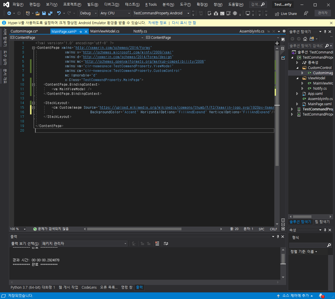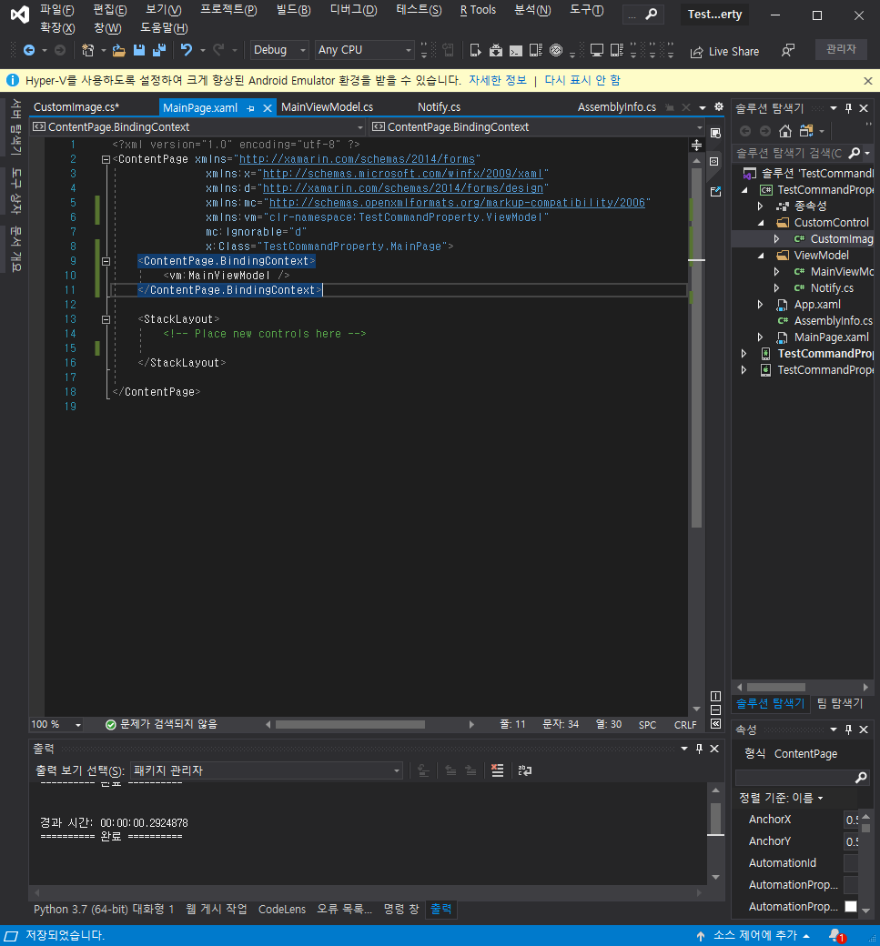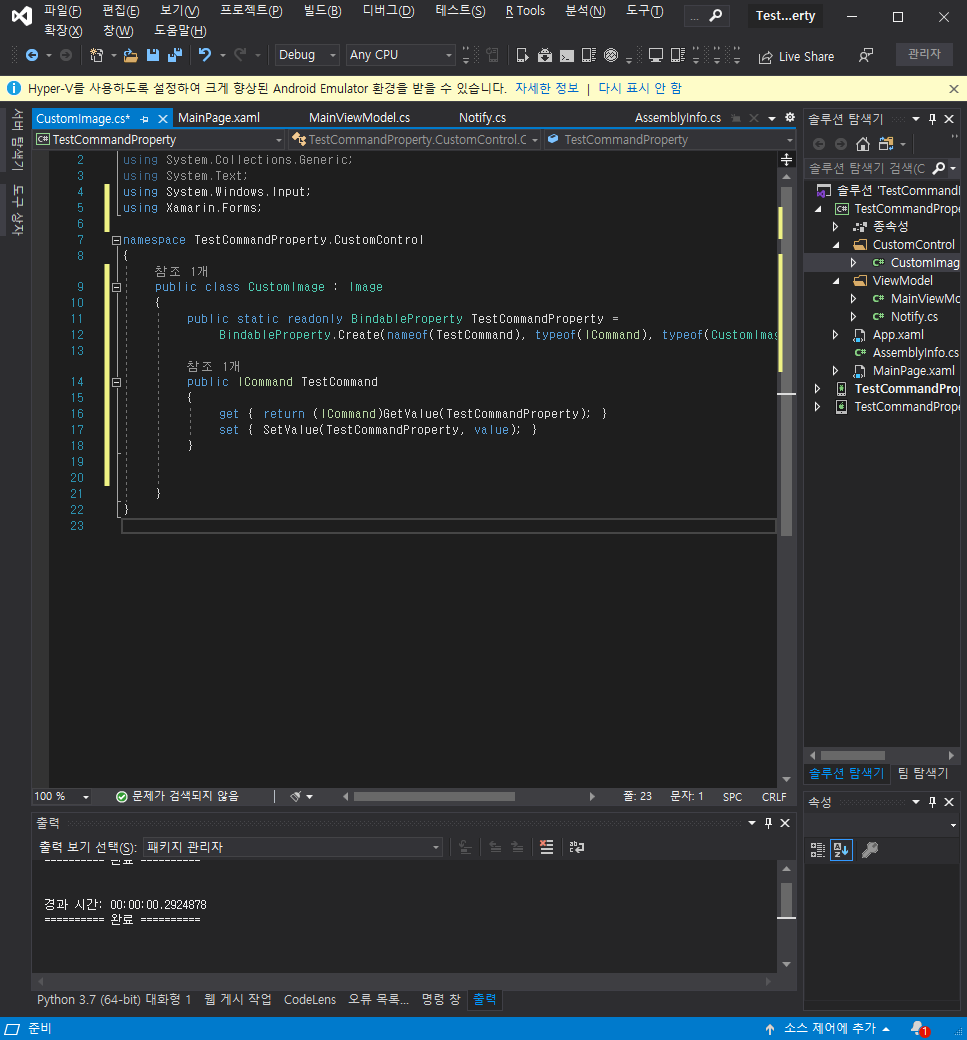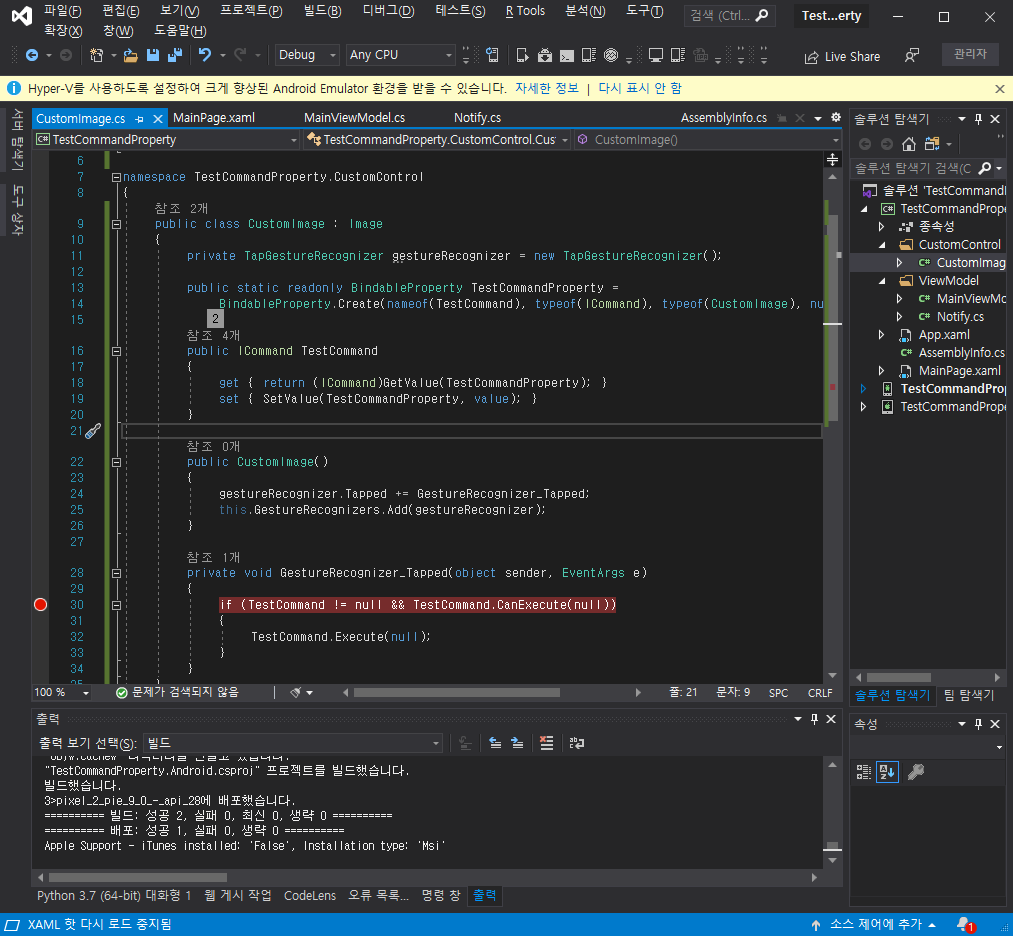 위의 이미지를 보면 CustomImage 컨트롤의 TestCommand 속성에 MainViewModel의 TestCommand를 바인딩하였습니다.
