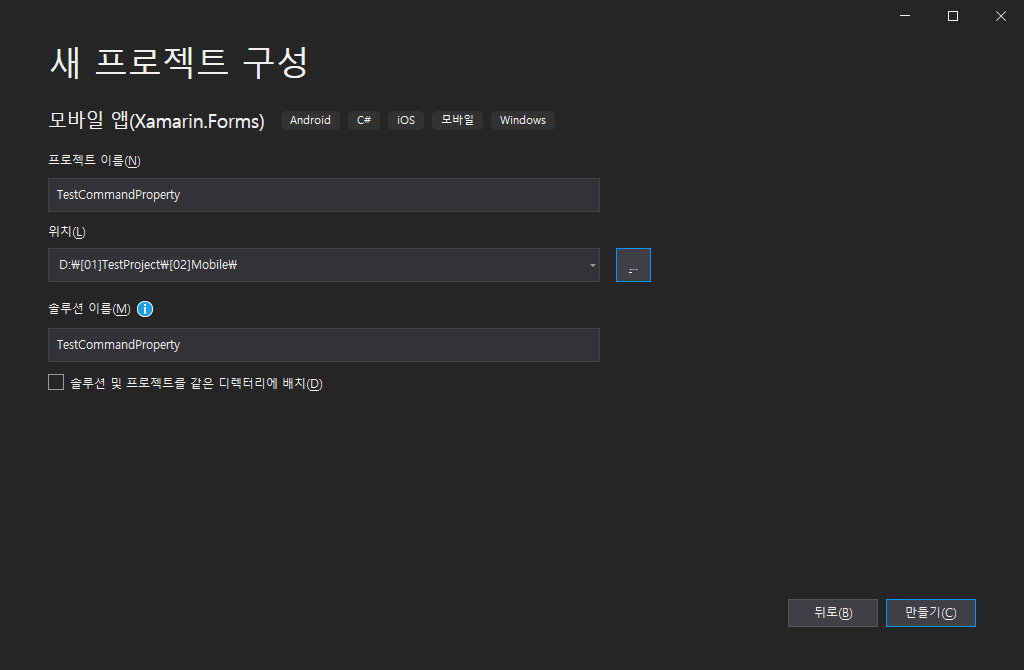 프로젝트 이름은 TestCommandProperty라고 작성하였습니다.