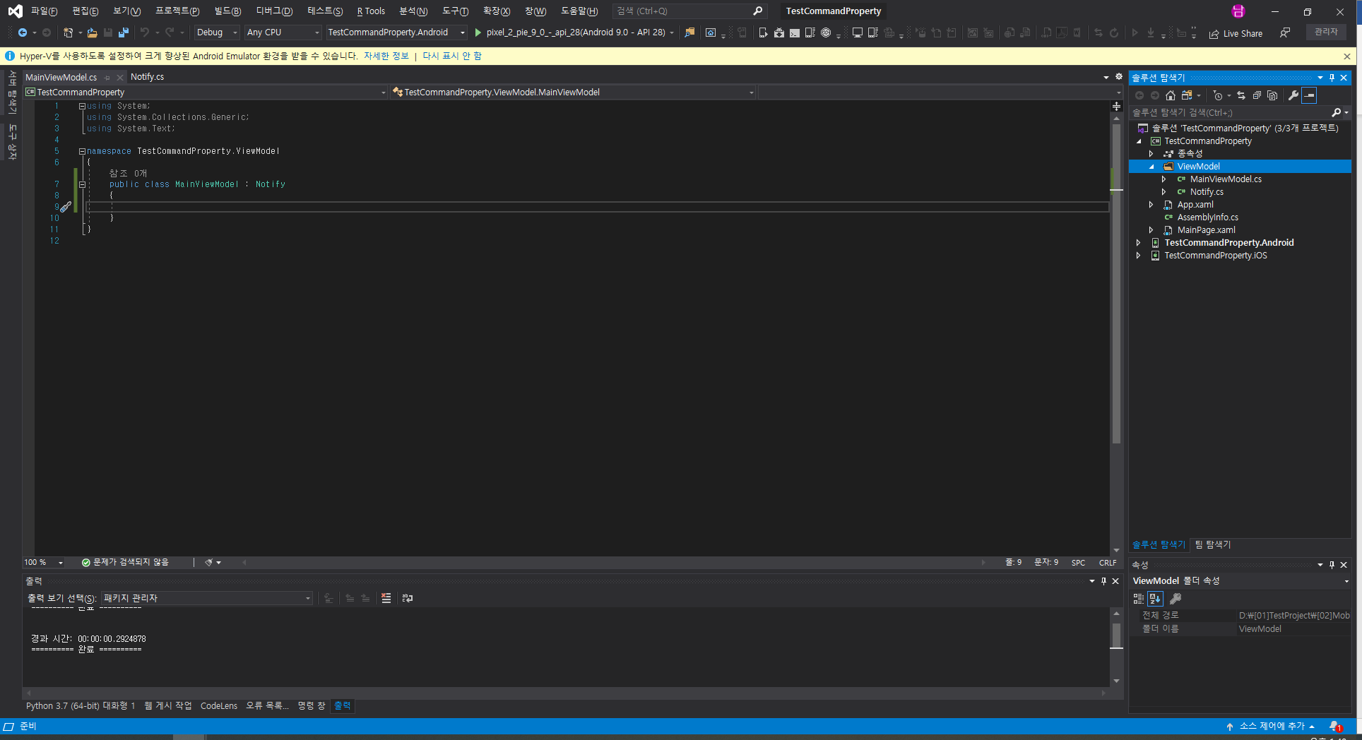 ViewModel 폴더에 MainPage.xaml에 해당하는 ViewModel로 MainViewModel이라는 클래스를 추가하고 앞에서 만들어둔 Notify클래스를 상속받아서 아래 이미지와 같이 준비해줍니다.