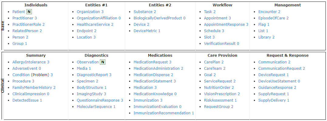 공식 홈페이지의 상단 메뉴바 Resource에 들어가면 FHIR에 있는 자원들을 볼 수 있습니다. 여러 자원들의 이용방법, 속성 등을 살펴볼 수 있습니다. 이 페이지를 통해 FHIR의 구조에 대해 어느 정도 파악할 수 있습니다.